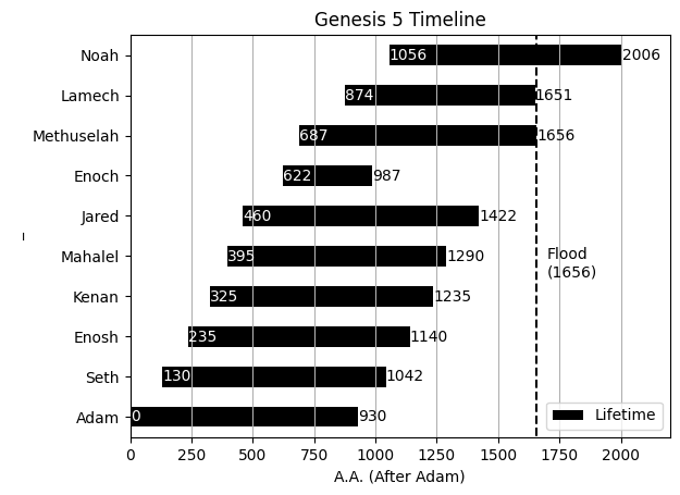 label=['_', 'Lifetime'], xlabel='A.A. (After Adam)', ylabel='_', title='Genesis 5 Timeline')
